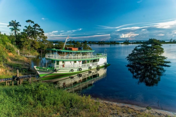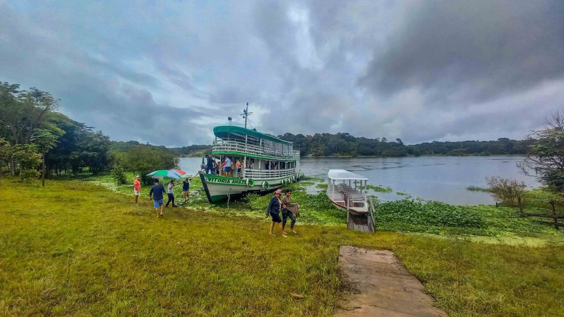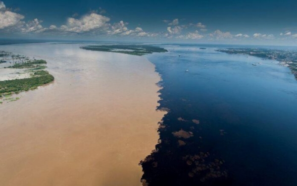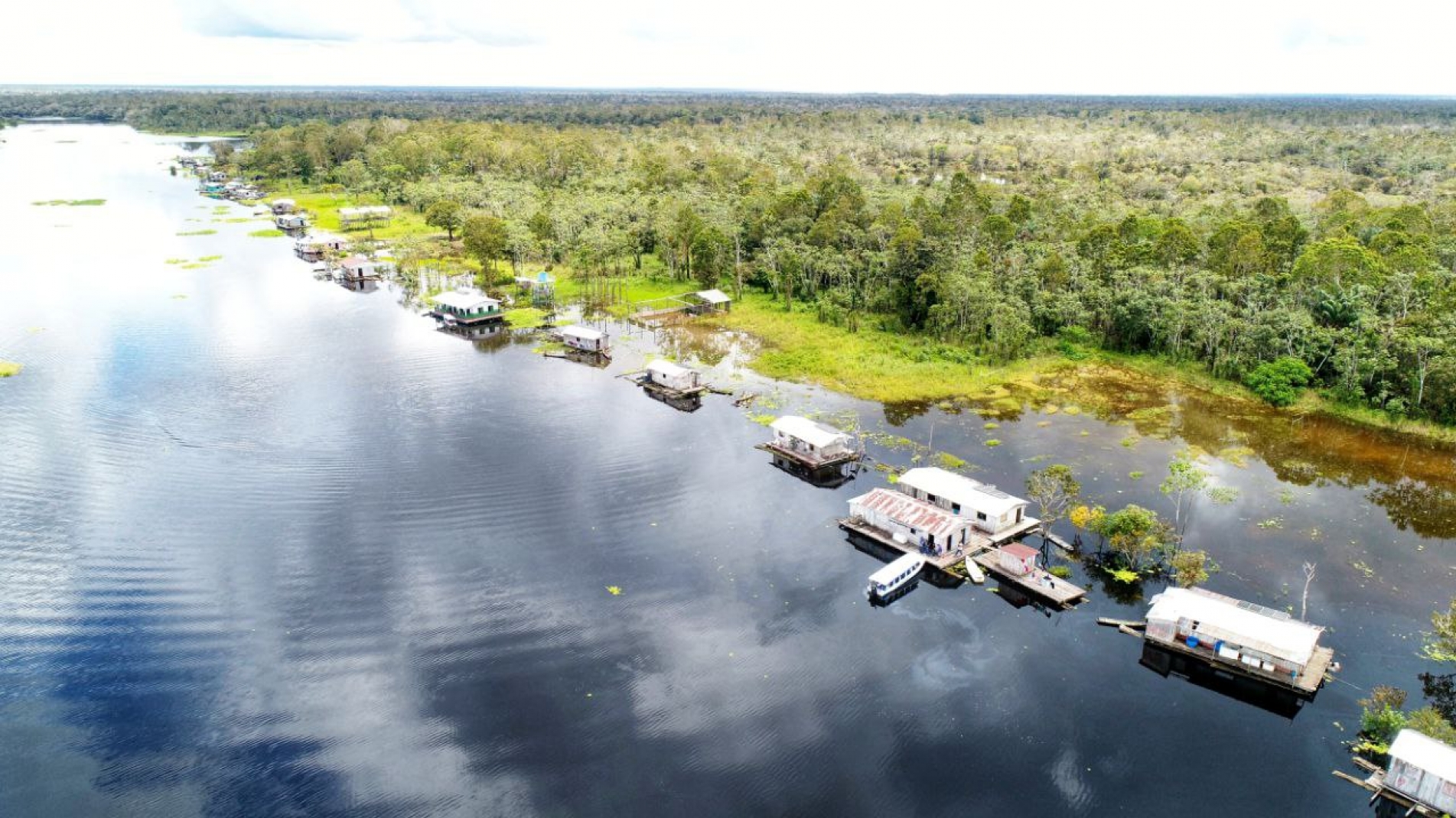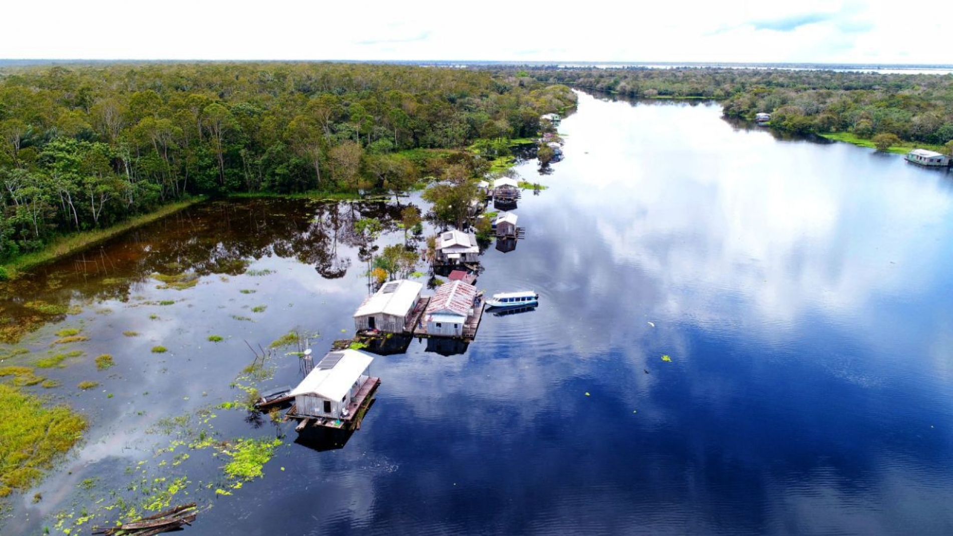 está situado entre dois rios: o Rio Miriti, com suas águas negras, e o Rio Solimões