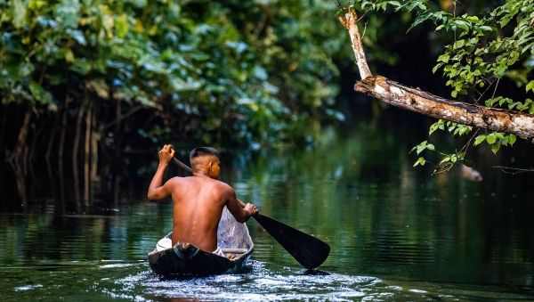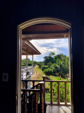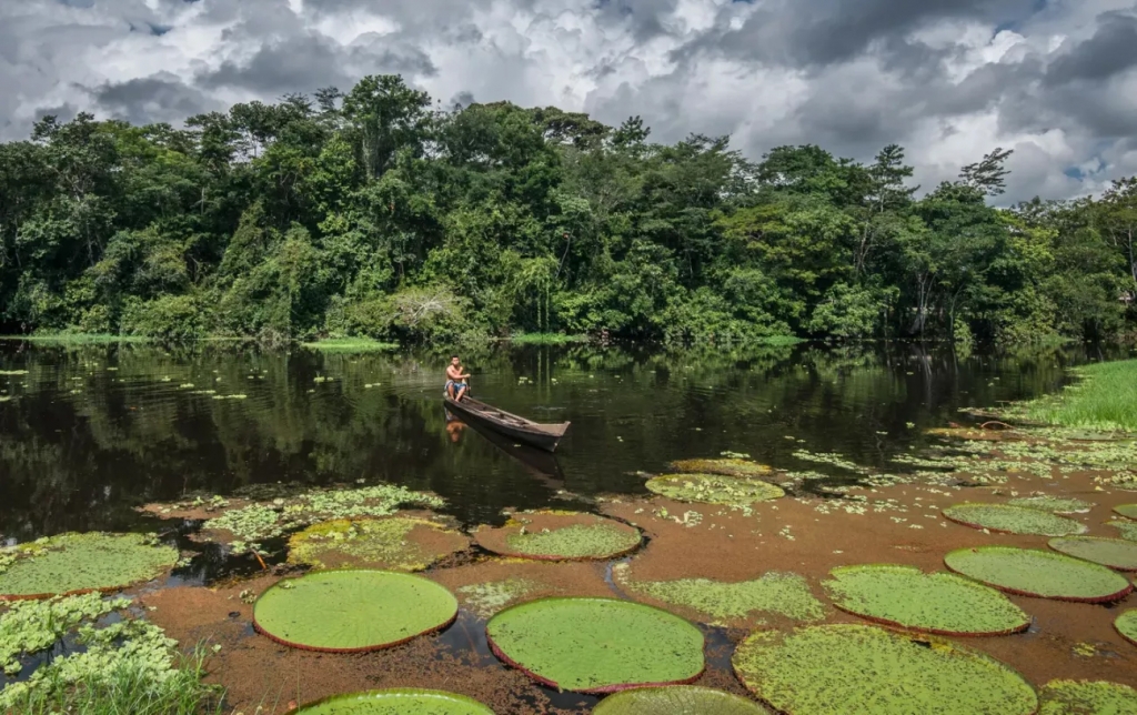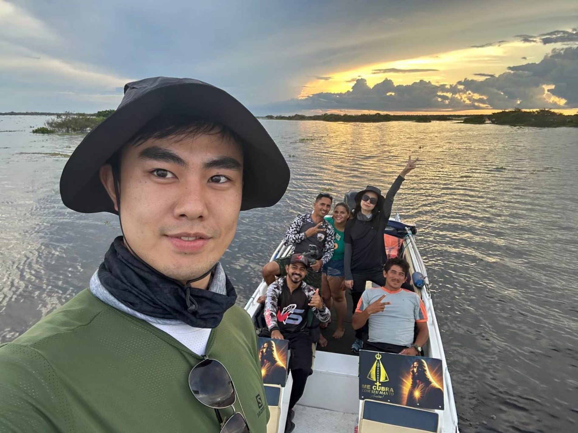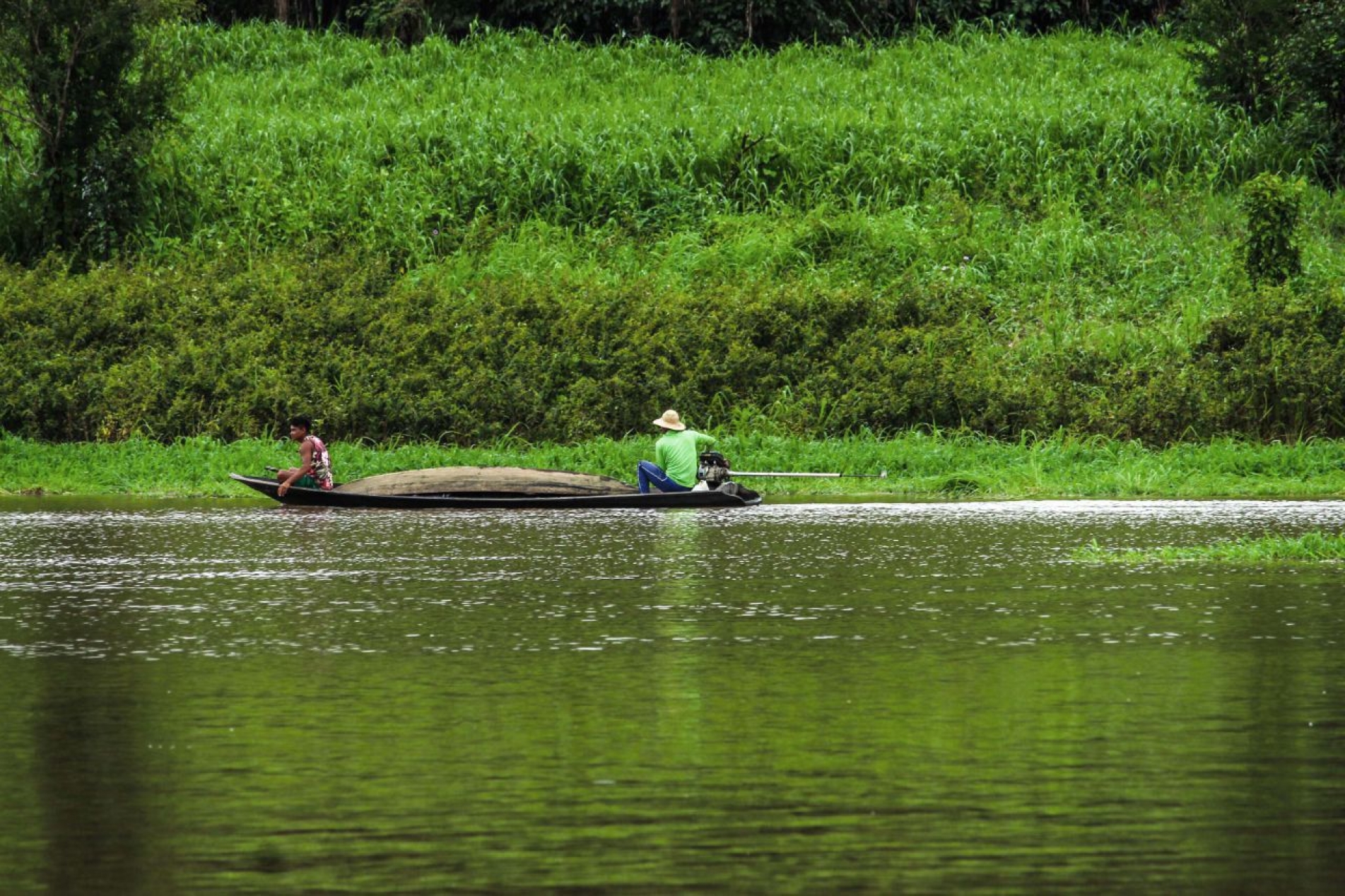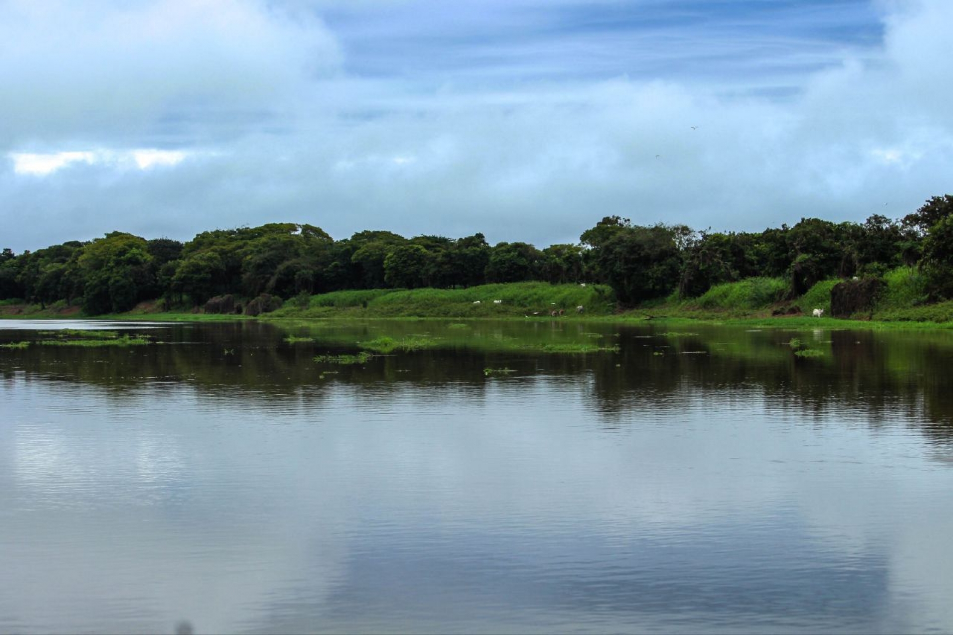 está situado entre dois rios: o Rio Miriti, com suas águas negras, e o Rio Solimões