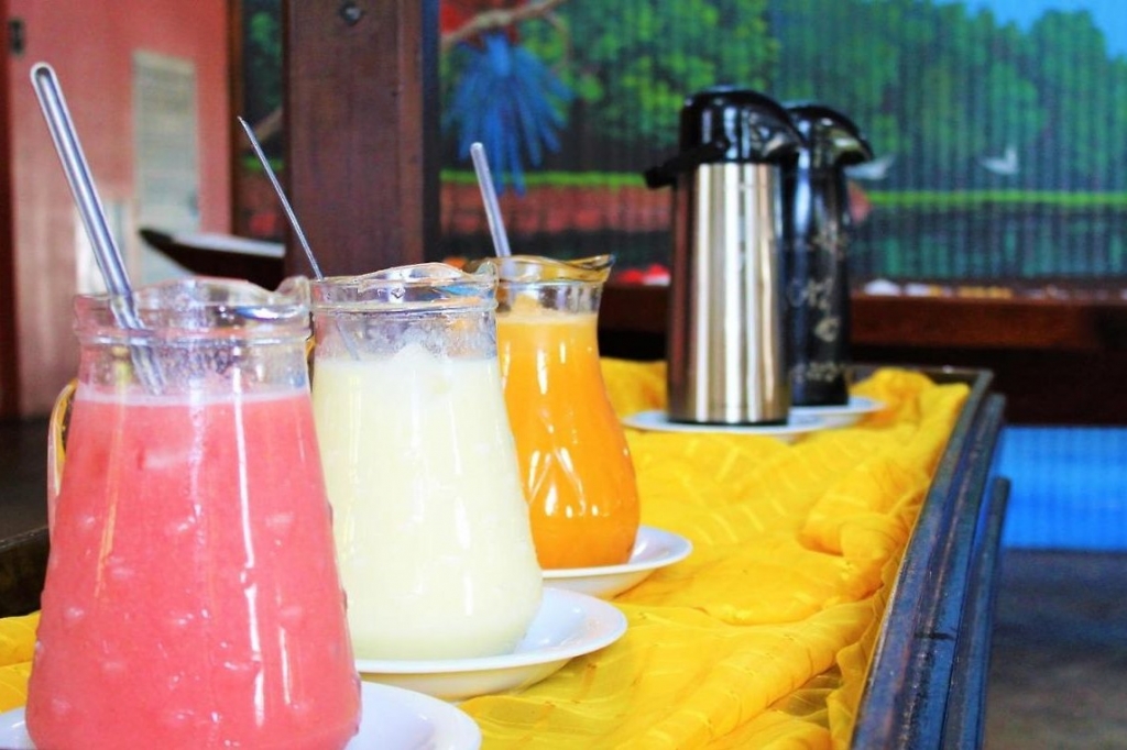 aves amazónicas mientras come o disfruta de una bebida refrescante hecha con frutas de la región.